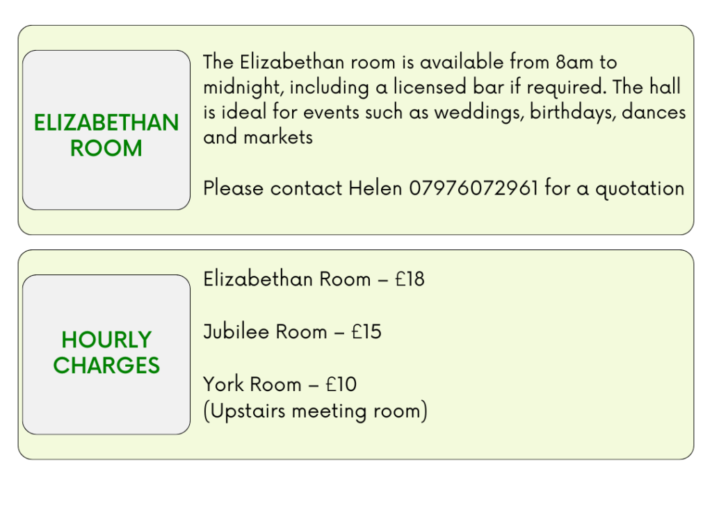 Please download & fill in a Booking Form and return to The Alexandra Hall, St.Augustine’s Gate, Hedon, HU12 8EX.